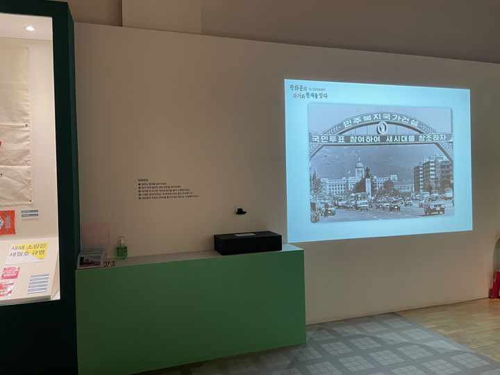대한민국역사박물관의 광화문 600년: 세 가지 이야기 전시의 메인 주제 영상 광화문 변천사부터 구술영상과 과거와 현재를 잇는 리포토그라피 프로그램으로